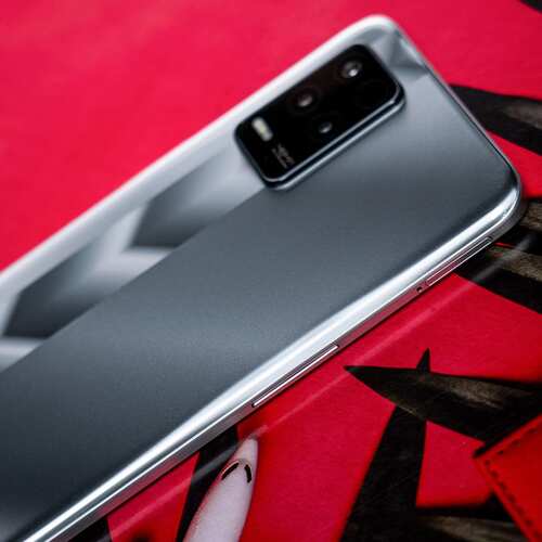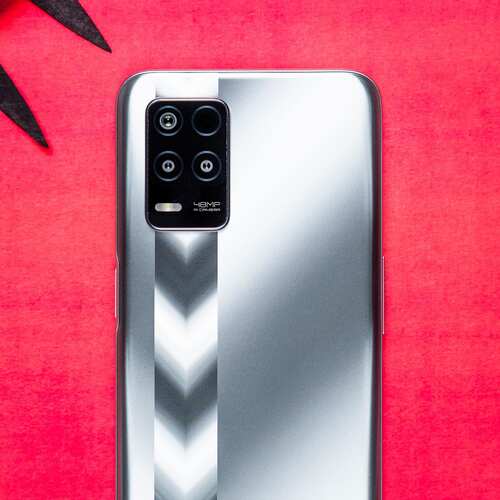 The Realme Narzo 30 5G comes with a polycarbonate back with what Realme describes as a ‘Racing Silver’ design. Silver owing to the colour. The phone also comes in a Racing Blue colour variant. It features a triple-rear camera setup that is placed inside a vertically placed camera module that is stacked towards the left side. This camera module is placed on top a silver strip with downward-facing arrow finish. The phone features a metallic chassis with a flat-screen design, all of which make the phone look quite sleek and premium. However, the back is a fingerprint magnet. Thankfully, Realme ships a transparent back cover that keeps smudges at bay.